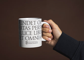 Un lot de productes oficials de la Universitat de Barcelona, format per una llibreta blanca A5, una tassa, un punt de llibre de la torre de l’Edifici Històric, una rajola de xocolata negra amb un 70 % de cacau acompanyada d’una postal de l’Edifici Històric i una capsa de Xocoünis.