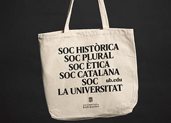 Un lot de productes oficials de la Universitat de Barcelona, format per un termos Runbott color blau, una bossa de tela de color cru, una rajola de xocolata negra amb un 70 % de cacau acompanyada d’una postal de l’Edifici Històric i una capsa de Xocoünis.